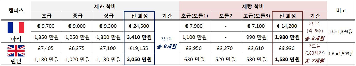 • 입학 시기는 파리 1월, 4월, 7월, 10월이며 런던